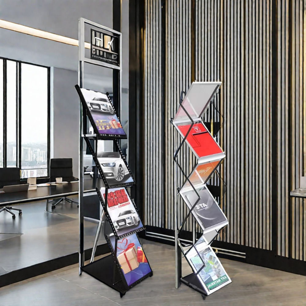 This modern custom library newspaper rack features durable metal construction and an environmentally friendly powder coating and electroplating process, ensuring long-lasting durability and aesthetic appeal. It’s ideal for retail stores and promotional displays. Custom logo printing and color options are available, providing diverse branding opportunities.