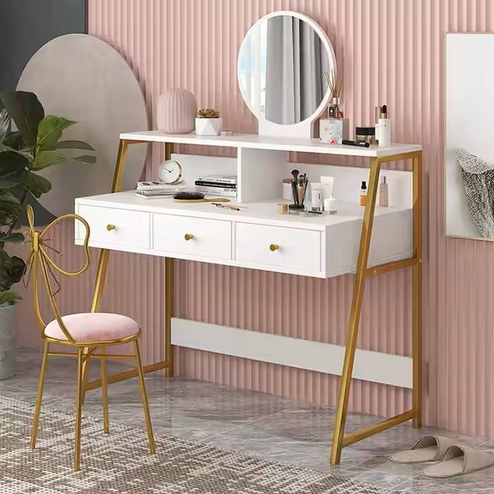 This modern makeup vanity desk set features a 3-color touch screen dimmable LED mirror, offering customizable lighting for precise makeup application. It includes 4 drawers for ample storage and is crafted from high-quality MDF material with a sleek white finish, blending functionality and elegance for bedrooms or other spaces.