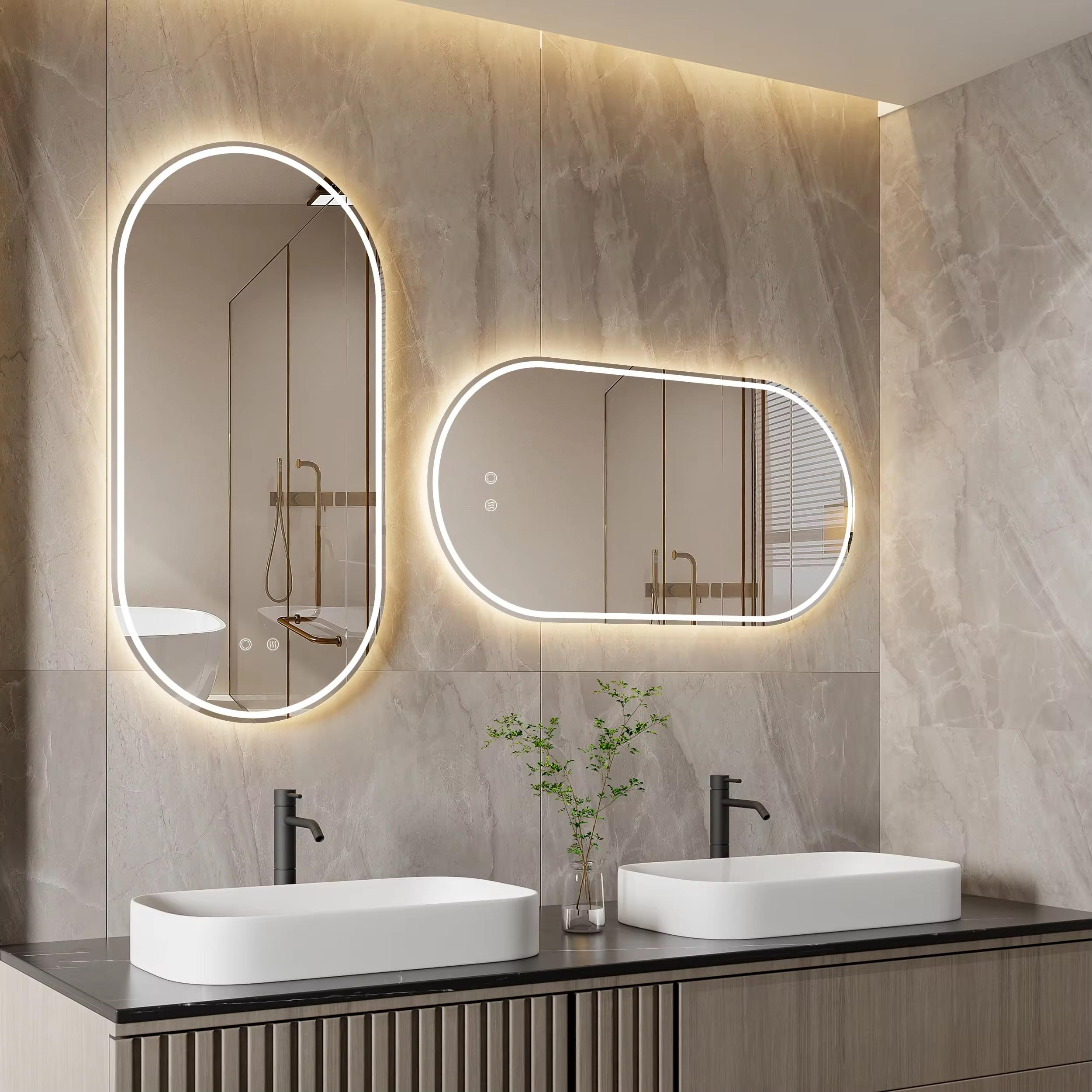 This modern frameless LED oval bathroom mirror features a smart touch sensor switch, anti-fog functionality, and dimmable lighting, making it perfect for bathroom, salon, or living room use. Its custom aluminum design and silver mirror with LED light strip ensure both durability and elegance. The product supports wall-mounted installation, offers a color temperature range of 3000k-6000k, and comes with a 2-year warranty and online technical support.
