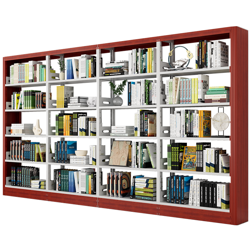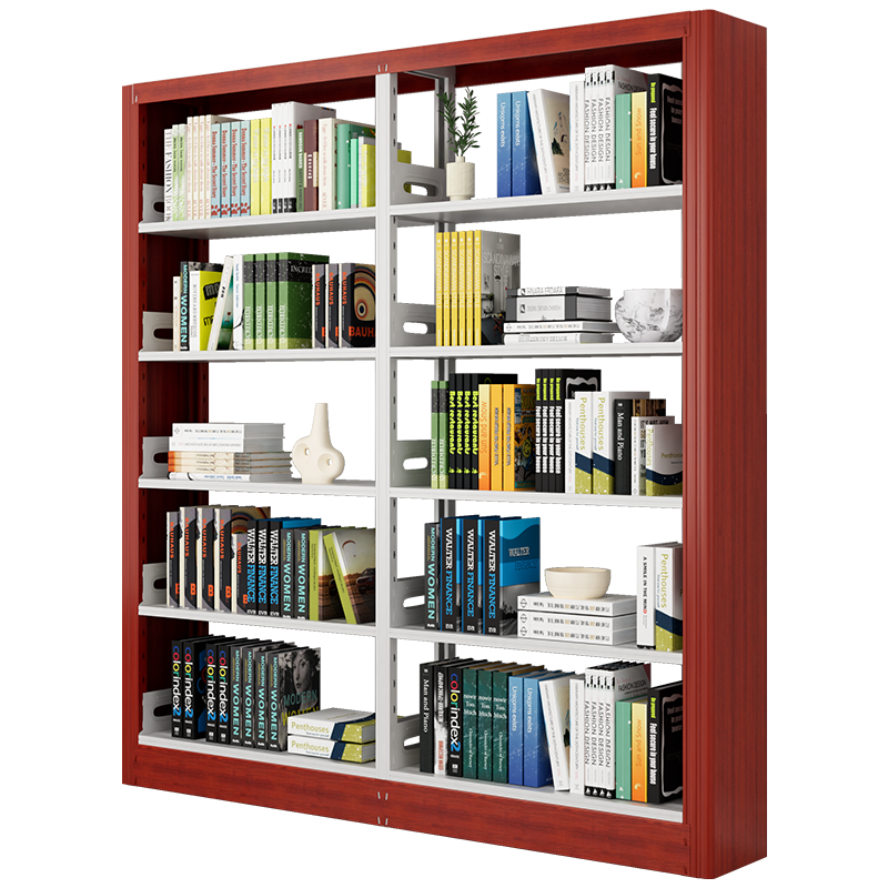 Modern high-quality steel bookshelves designed for home offices and living rooms, featuring a red wood grain finish that combines aesthetics with durability. The thickened material ensures excellent load-bearing capacity, while the customizable size and color options provide versatility. The main and sub-frames can be spliced for extended functionality.
