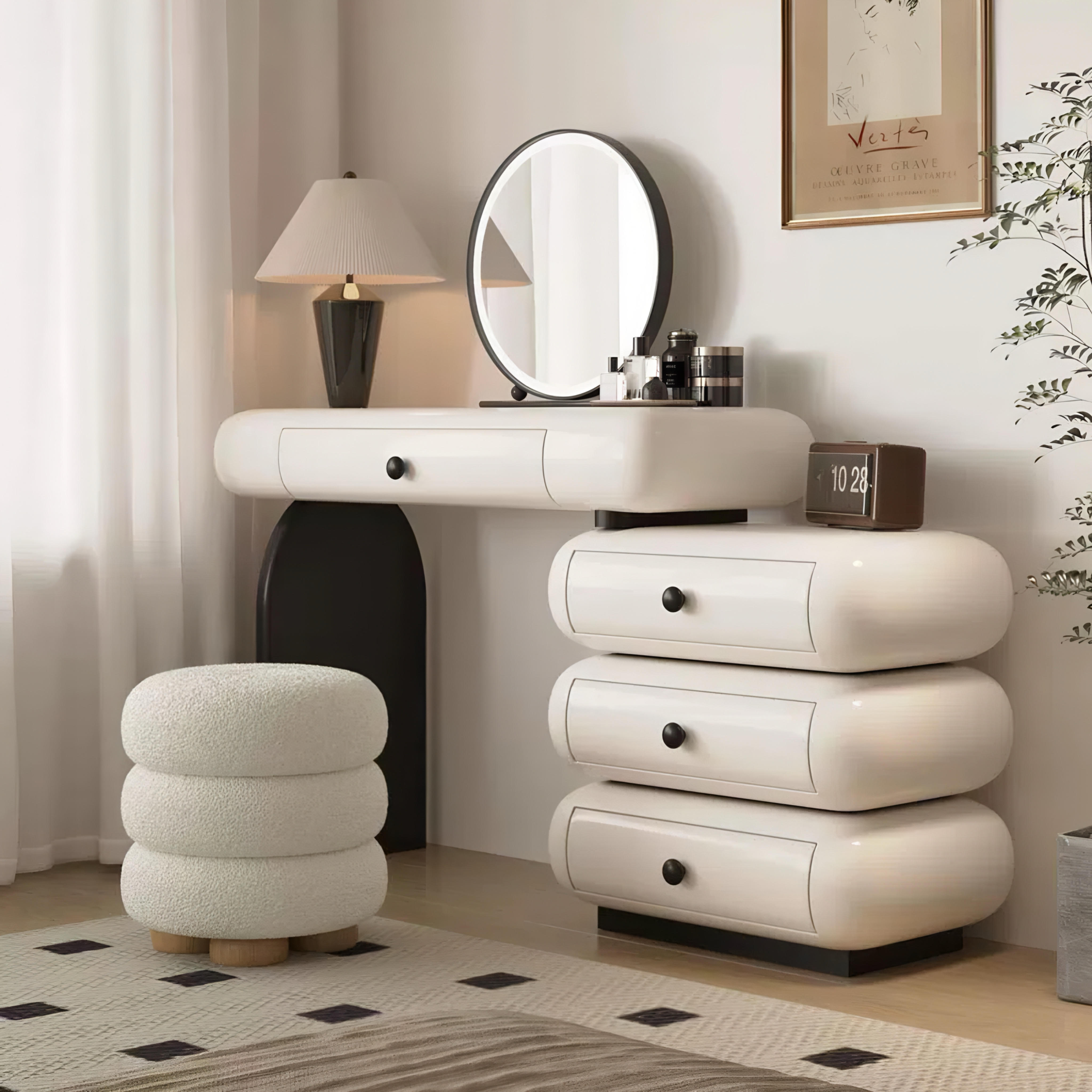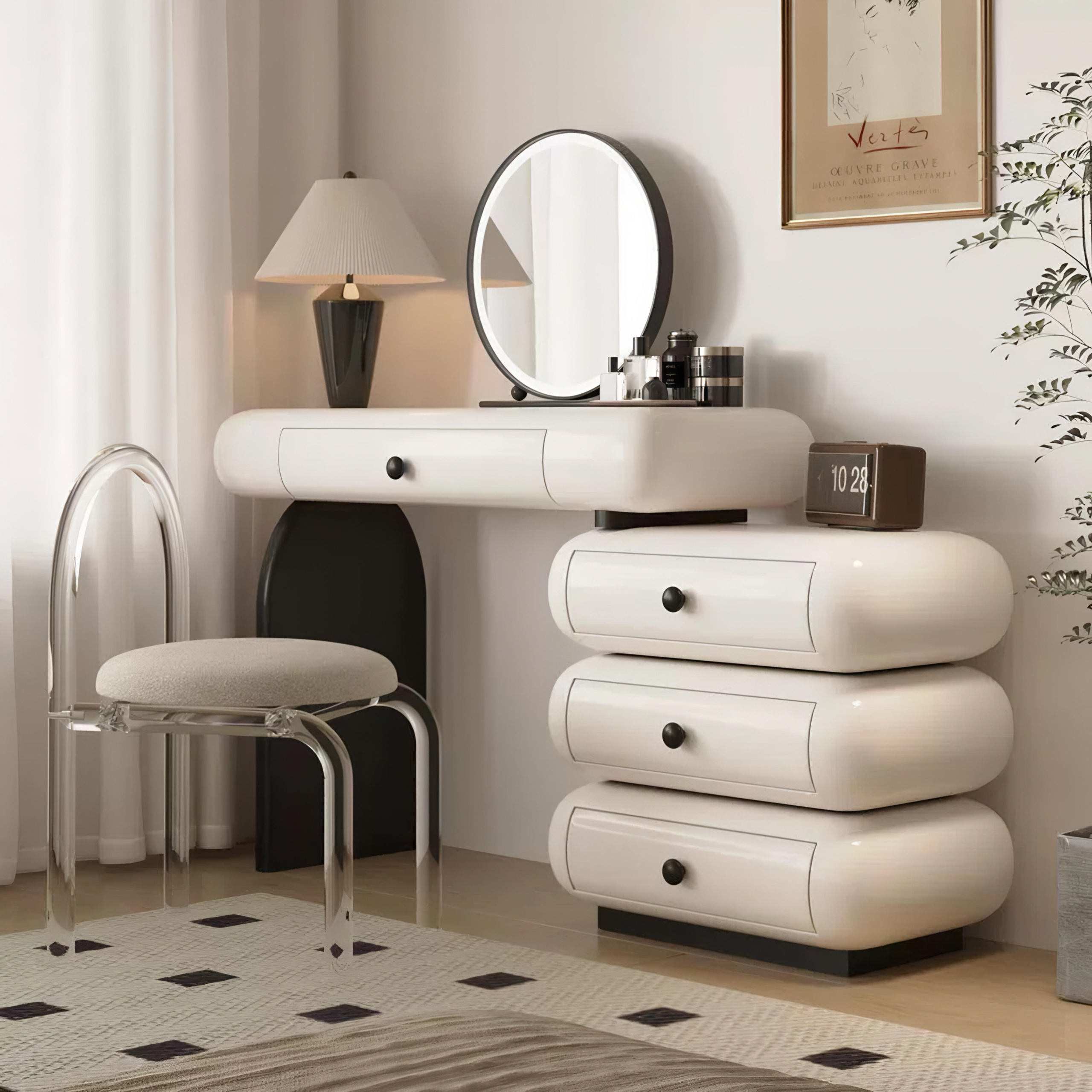 This modern vanity is crafted from medium-density fiberboard (MDF) for a modern design and durability. It features a three-color touchscreen dimmable LED mirror for customizable lighting and precise makeup application. Includes drawers for ample storage space. This stylish vanity, available in a variety of colors, is ideal for any home or apartment.