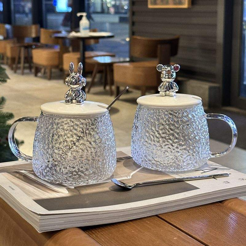 Simple style glass coffee cup with cartoon bear lid 400ML transparent glass coffee cup